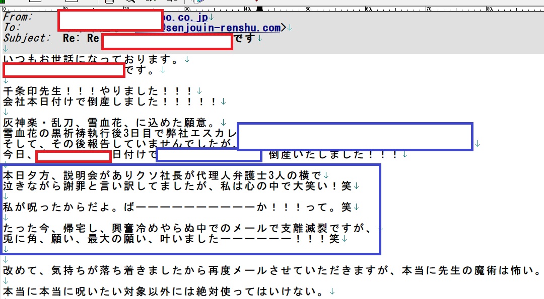 最後に。先生と出会えてよかった。HP見て、私もこんな報告したいって毎日思い、うまくいかない現状から先生に何度泣き言を言った事か。小さな術効はこれまでにもあり数回報告しました。そして『夏以降が楽しみですね』という先生の言葉…まんまでした!嫁達も人型で呪ってます。残されたなんの取り柄もない嫁達がどうなるか知れてますので、ある日突然一気に効果が爆発する、という結論も出ました。先生、本当に今までありがとうございました!本当に本当にありがとうございました!残りの5枚の人型は今後の人生で必要があれば使用させて頂きます。ここまで人を憎む事はないと思いますので、小さい事ならすぐ効果が出そう(笑)だって本当に呪い殺せたのだから!
