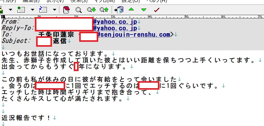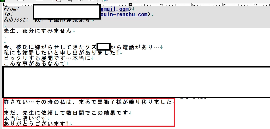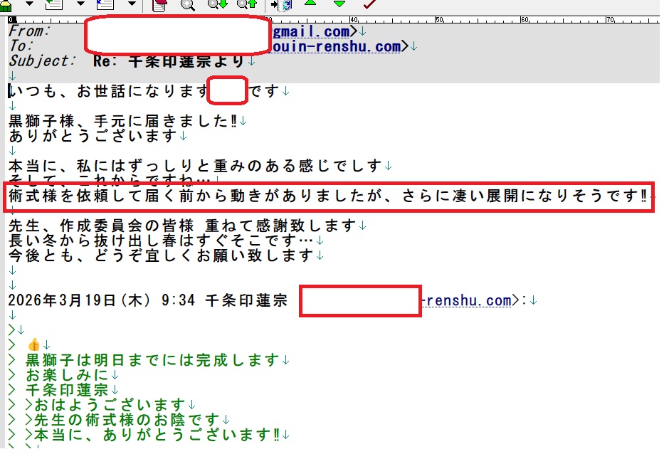蓮宗様とご縁があって、本当に良かったです!それと黒の術効報告でこのメールの二つ前にお送りしたメールをぜひご覧になってください笑 あと、また